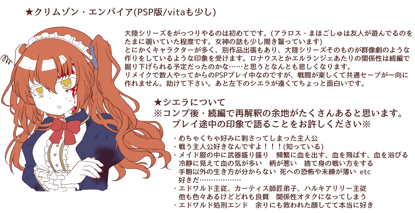 繰り返しになりますがシエラ=ロザン好きです。攻略途中で記事を書いたのは良さを吐き出した過ぎて歴代好きな乙ゲー主人公年表みたいな記事を練成しかけたからです。とんでもない長文怪文書が出来そうだったので踏みとどまれて良かった…